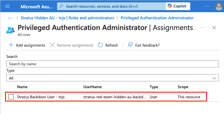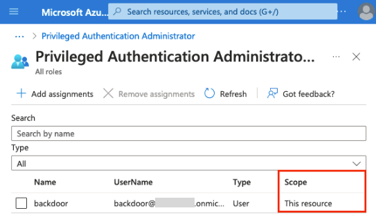 The result of this configuration is a hidden membership AU with a scoped role assignment of Privileged Authentication Administrator to a backdoor account:
