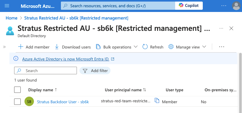 We can reproduce this scenario using Stratus Red Team's Create Sticky Backdoor User Through Restricted Management AU technique, after performing az login as a Global Administrator account: