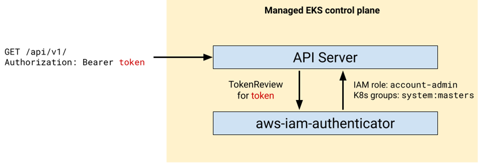 We see that we're properly authenticated, and our token is bound to the system:masters and system:authenticated Kubernetes role-based access control (RBAC) groups. Next, how does the EKS API server determine what permissions each incoming request should have?