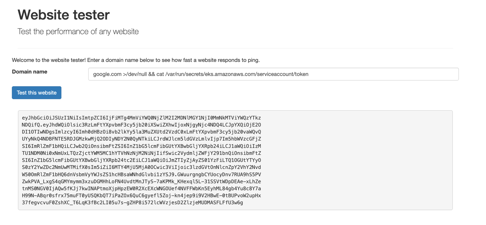 $ JWT=$(kubectl exec -it webserver -- cat /var/run/secrets/eks.amazonaws.com/serviceaccount/token)