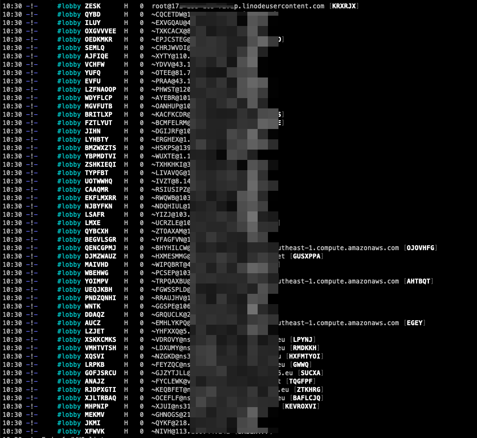 We have observed another campaign leveraging the same infrastructure, that compromises servers with open Docker API endpoints by delivering an UPX-packed version of an IRC backdoor, "ziggystartux," which is available on GitHub. The address of the C2 server is embedded in the binary and is open on the internet for anyone to join. This allowed us to retrieve the list of compromised machines: