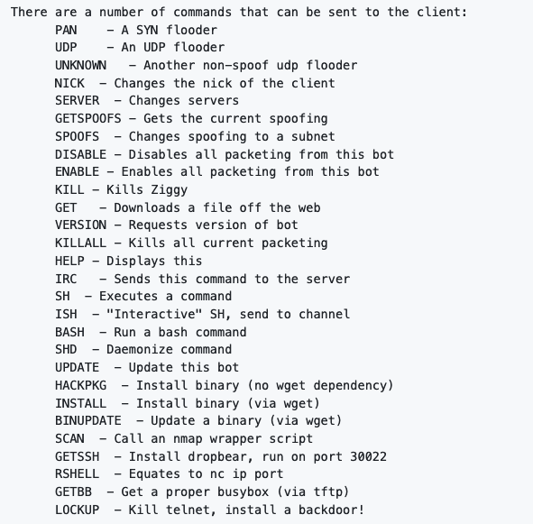 From this IRC channel, the attacker can send a number of commands to their "bots":