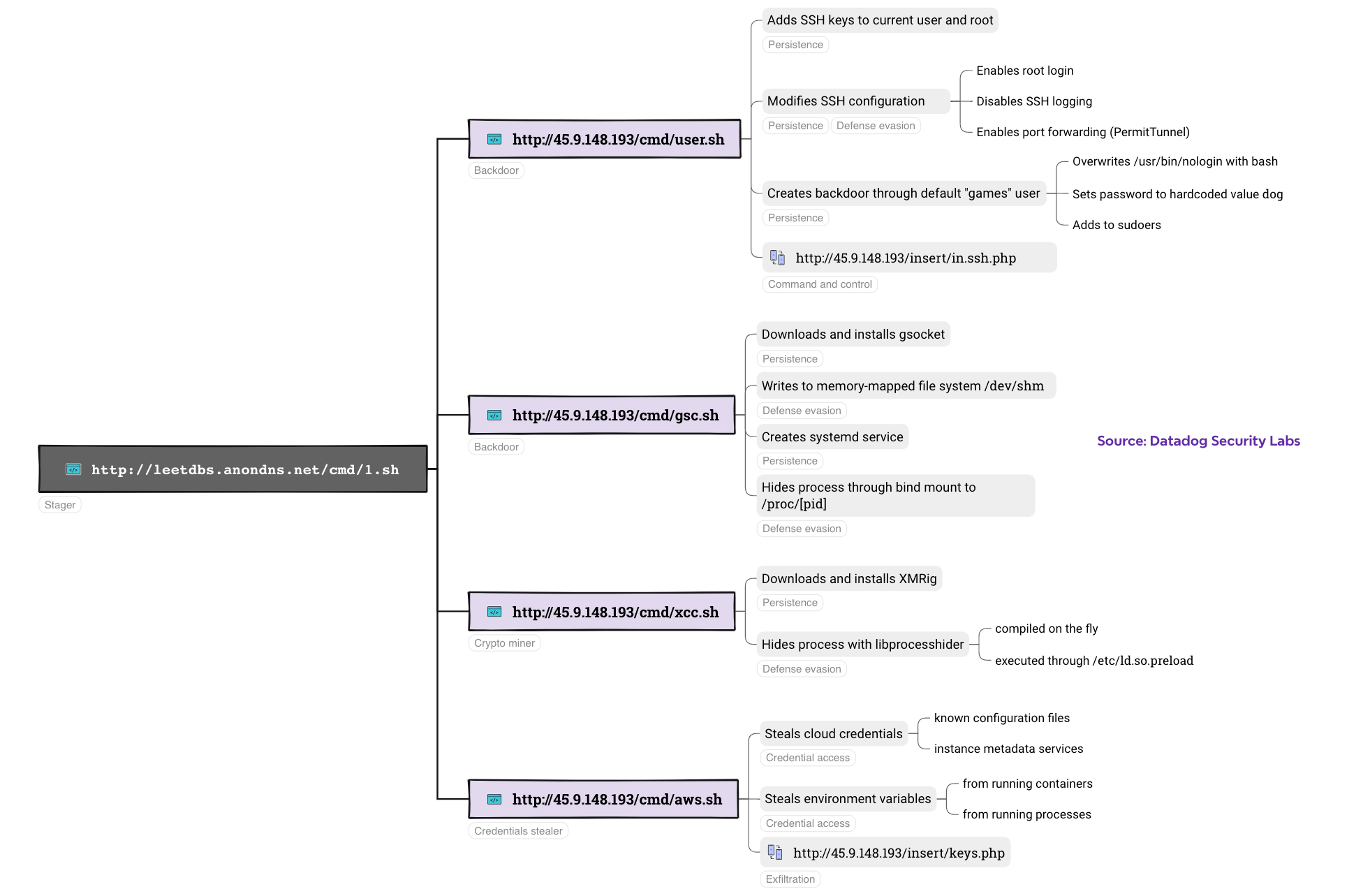 As we've seen in previous sections, this campaign leverages several scripts to establish persistence, backdoor the system, and steal cloud credentials.