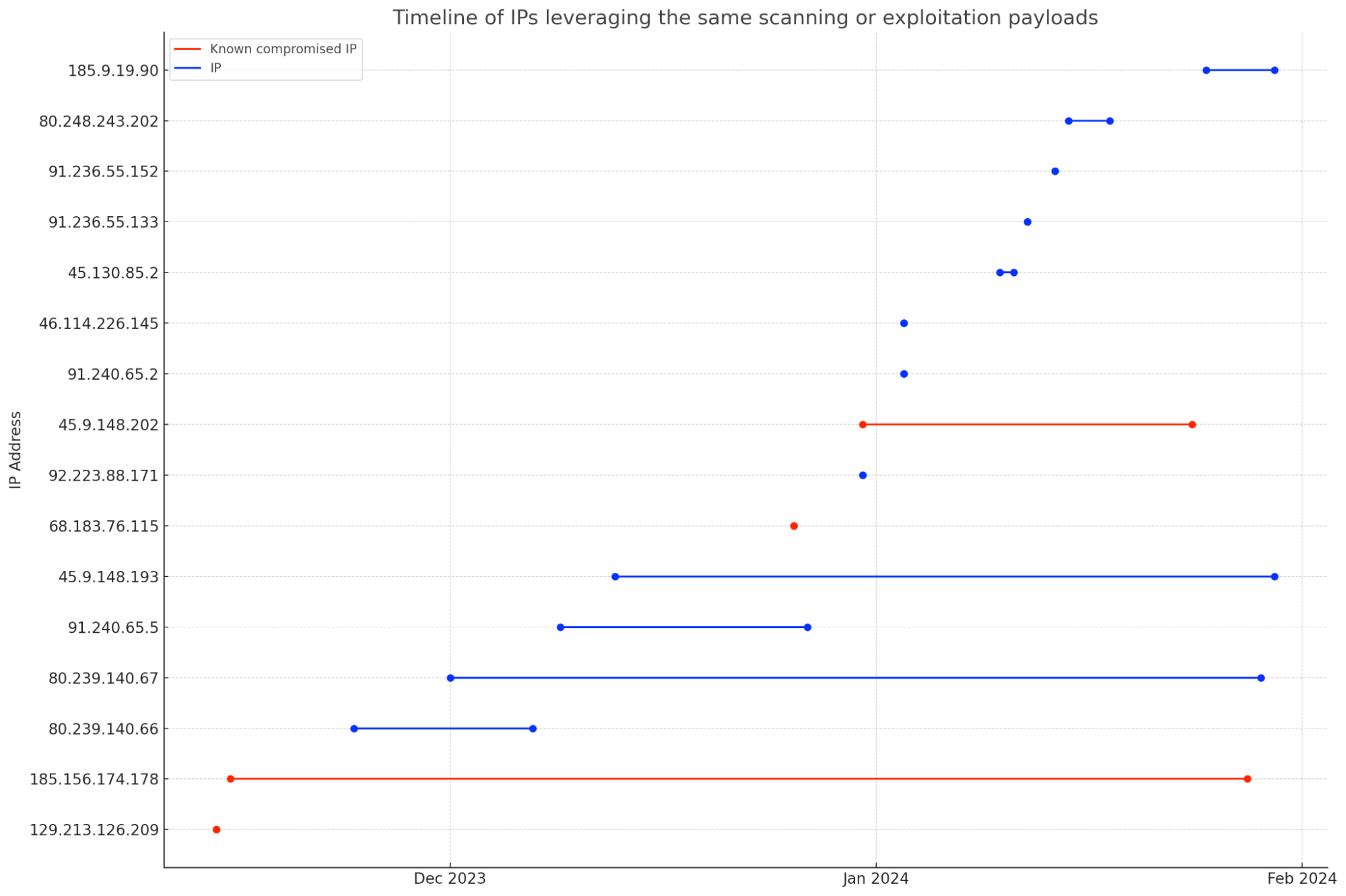We have observed the threat actor leveraging several compromised hosts to perform scanning activities and spread the reach of their campaign further. Specifically, we searched our honeypots for scanning or exploitation activity that resembled the patterns we had already observed and found a number of IPs that had been performing similar activities.