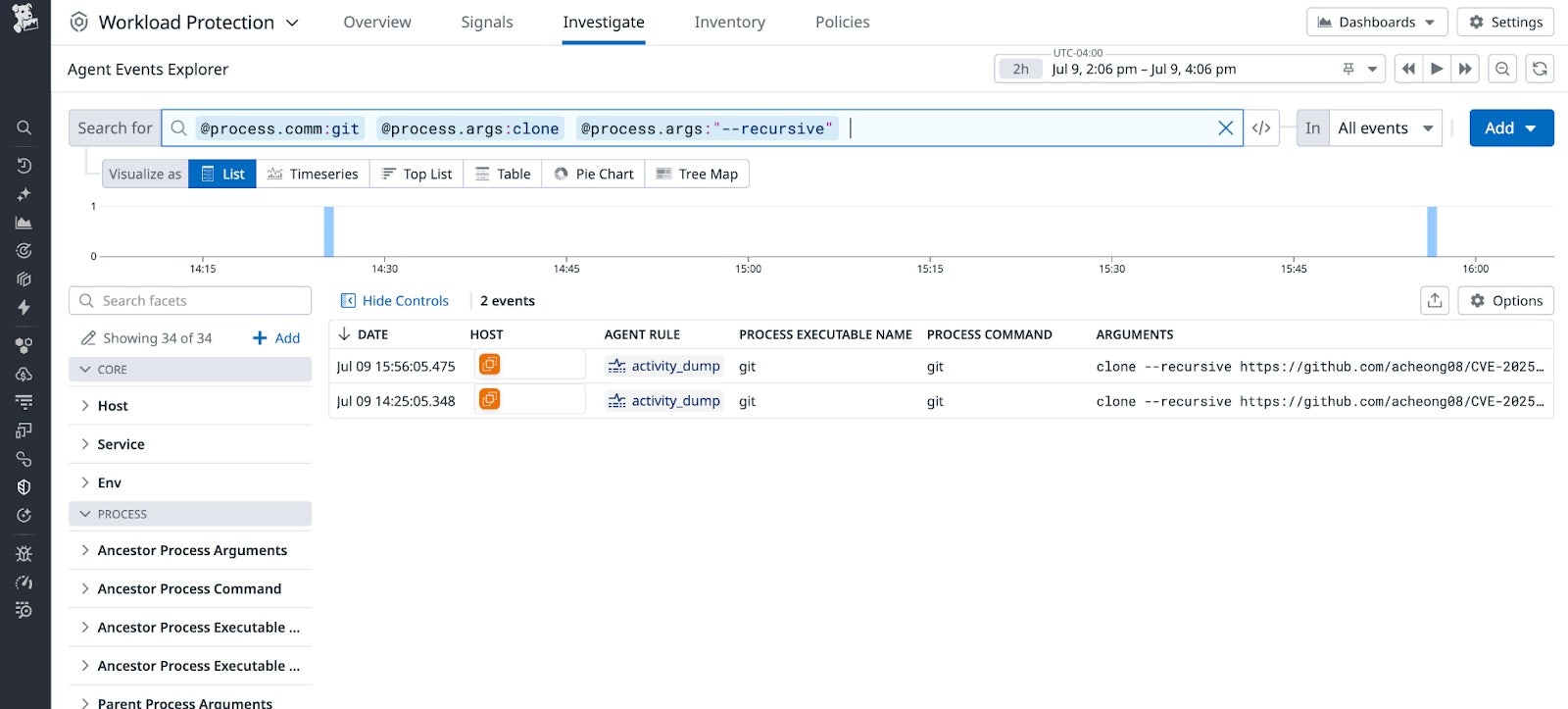 - Workload Protection customers can also deploy this expression as a custom Agent rule to detect potential exploitation. This rule may need to be tuned to exclude legitimate hooks or repositories: