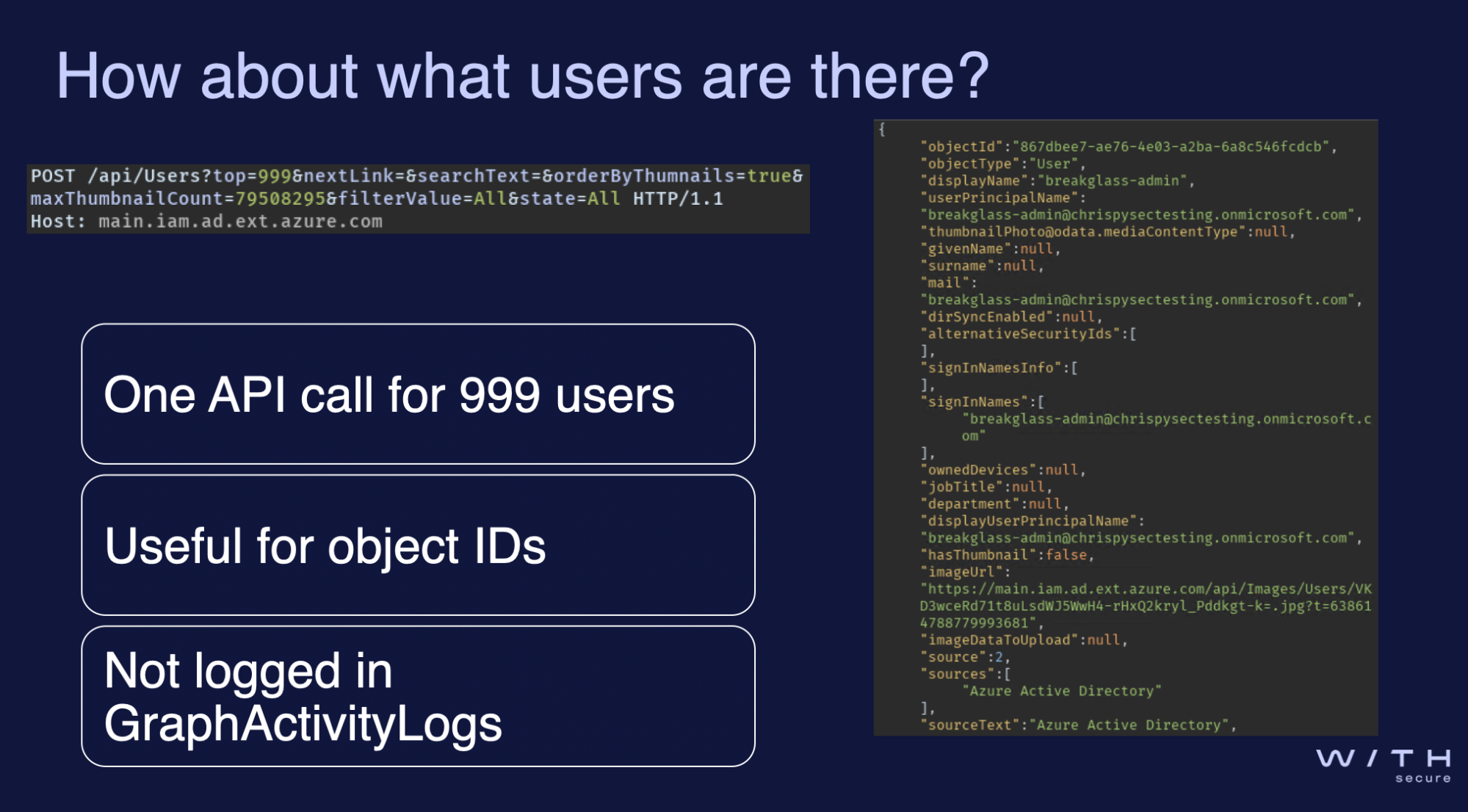 Christian Philipov presented some offensive-focused research in Microsoft Azure, diving into how an attacker who has compromised an initial user can use different Microsoft APIs to further enumerate the environment and stay under the radar. The key is to leverage undocumented APIs used by the Azure portal rather than going through Microsoft Graph. With this method, it's possible to enumerate various permissions and group memberships without generating any Entra ID audit logs.