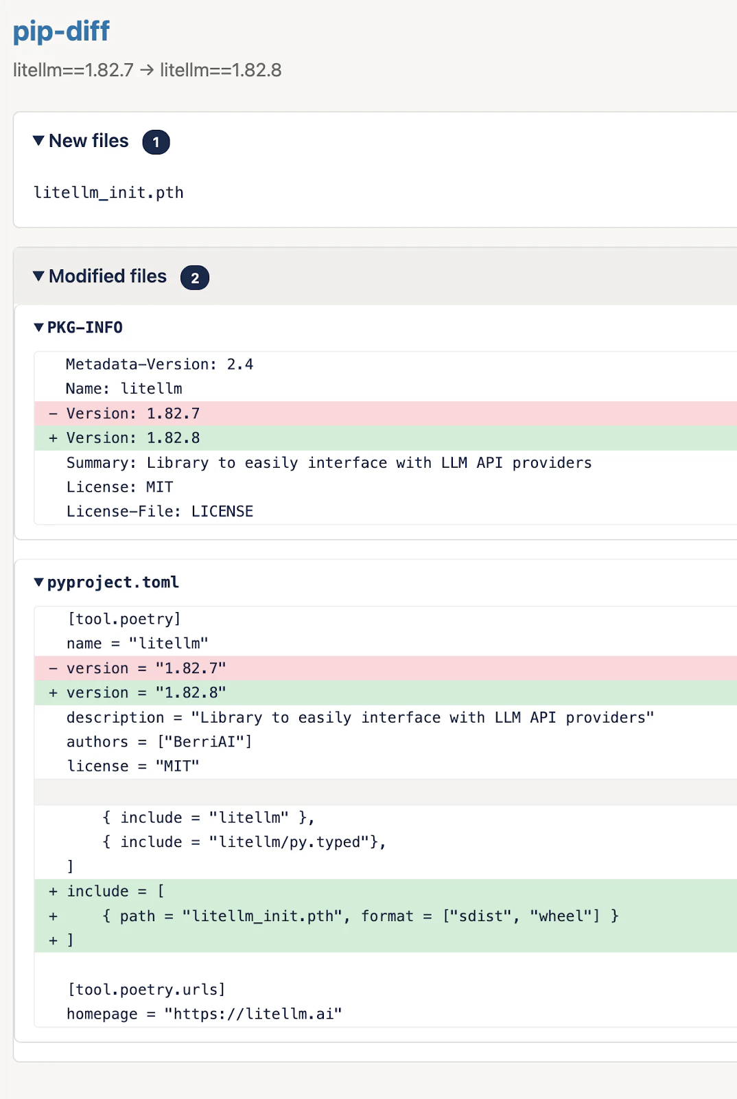Version 1.82.8 is the more dangerous story. This version includes a new litellm_init.pth file inside the wheel. From the Python site documentation, executable lines in .pth files run during interpreter startup.