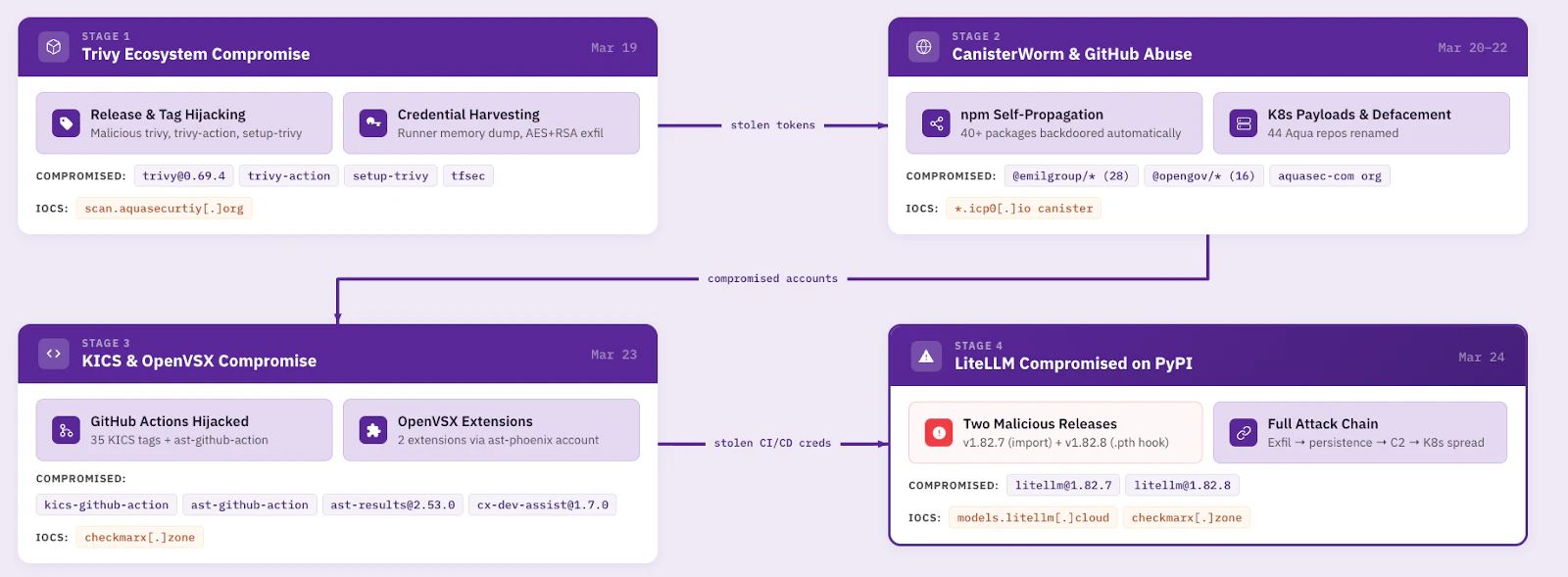 March 23 is the clearest bridge into the LiteLLM compromise. By then, the attacker had already demonstrated a repeated pattern against GitHub Actions, package registries, and developer tooling in more than one vendor environment.