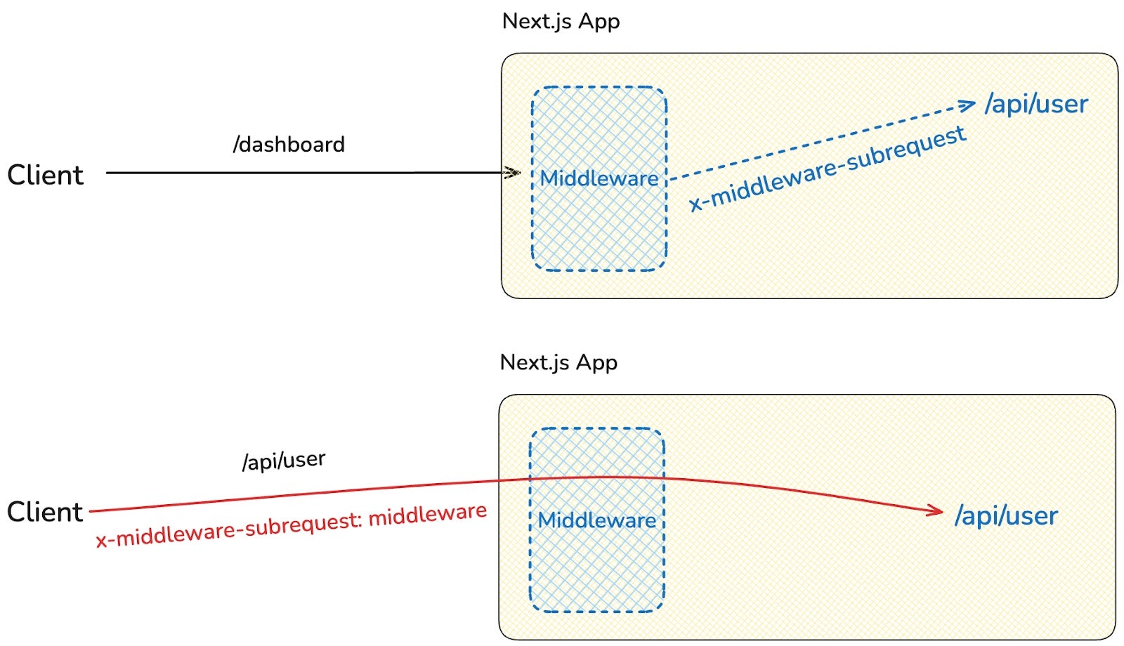 The Next.js internal logic then reads the header and completely bypasses the middleware, knowing that this request is an internal subrequest.