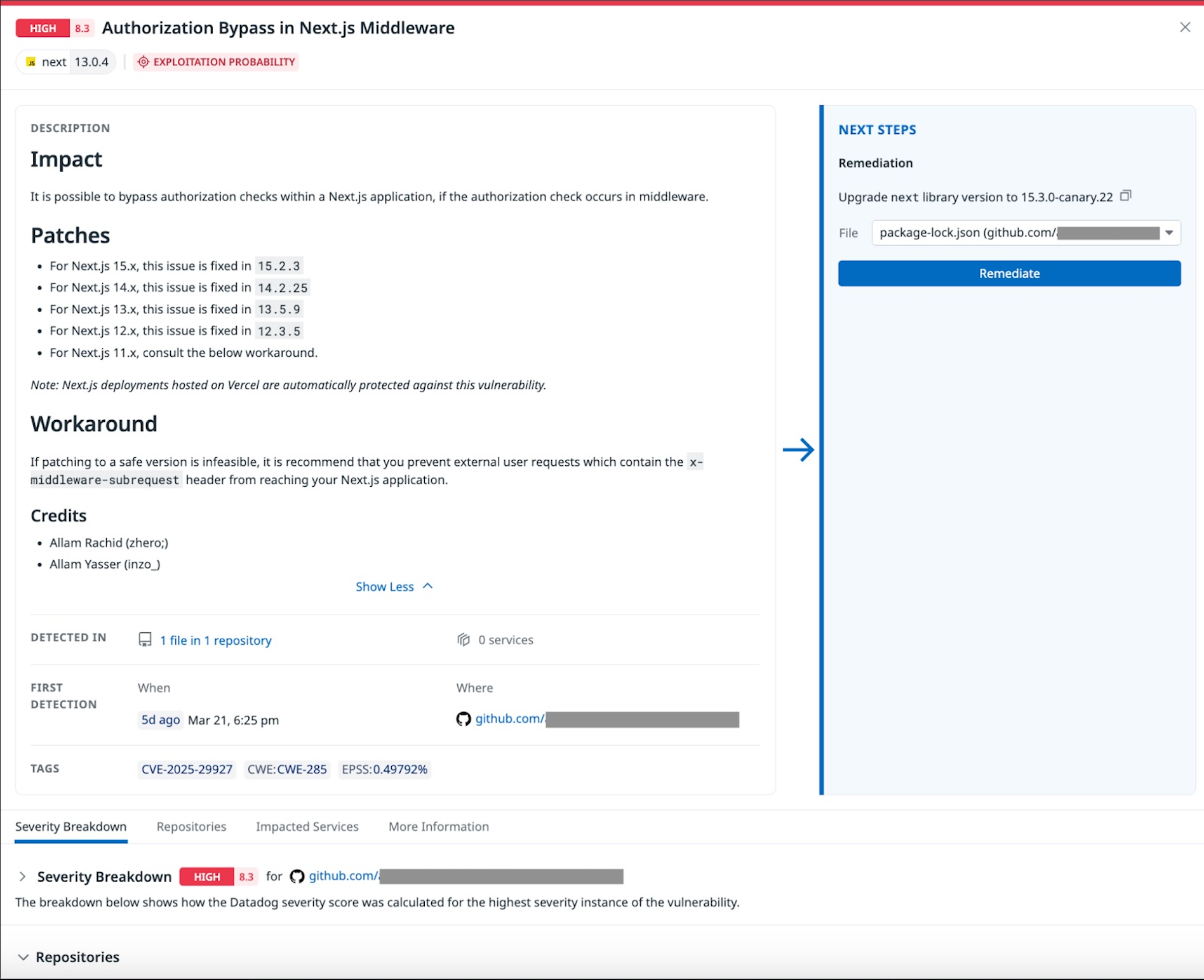 Datadog Code Security customers can use Code Security Vulnerabilities to identify any services that are vulnerable by running this query: status:Open cve:CVE-2025-29927 is_publicly_accessible:"Accessible". We recommend that customers prioritize patching public-facing Next.js services.