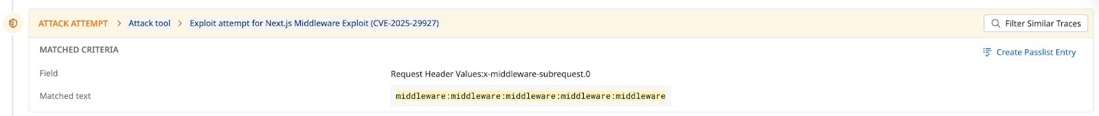 Datadog Application Security Management (ASM) customers can block exploitation of this vulnerability by using our WAF rule for Exploit attempt for Next.js Middleware Exploit (CVE-2025-29927).