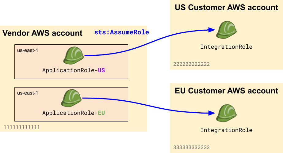 When that's the case, consider using a dedicated outbound integration role per region, and instruct customers in each region to trust the appropriate role. If your backend application is compromised in a single region, an attacker would not be able to access customer accounts in other regions.