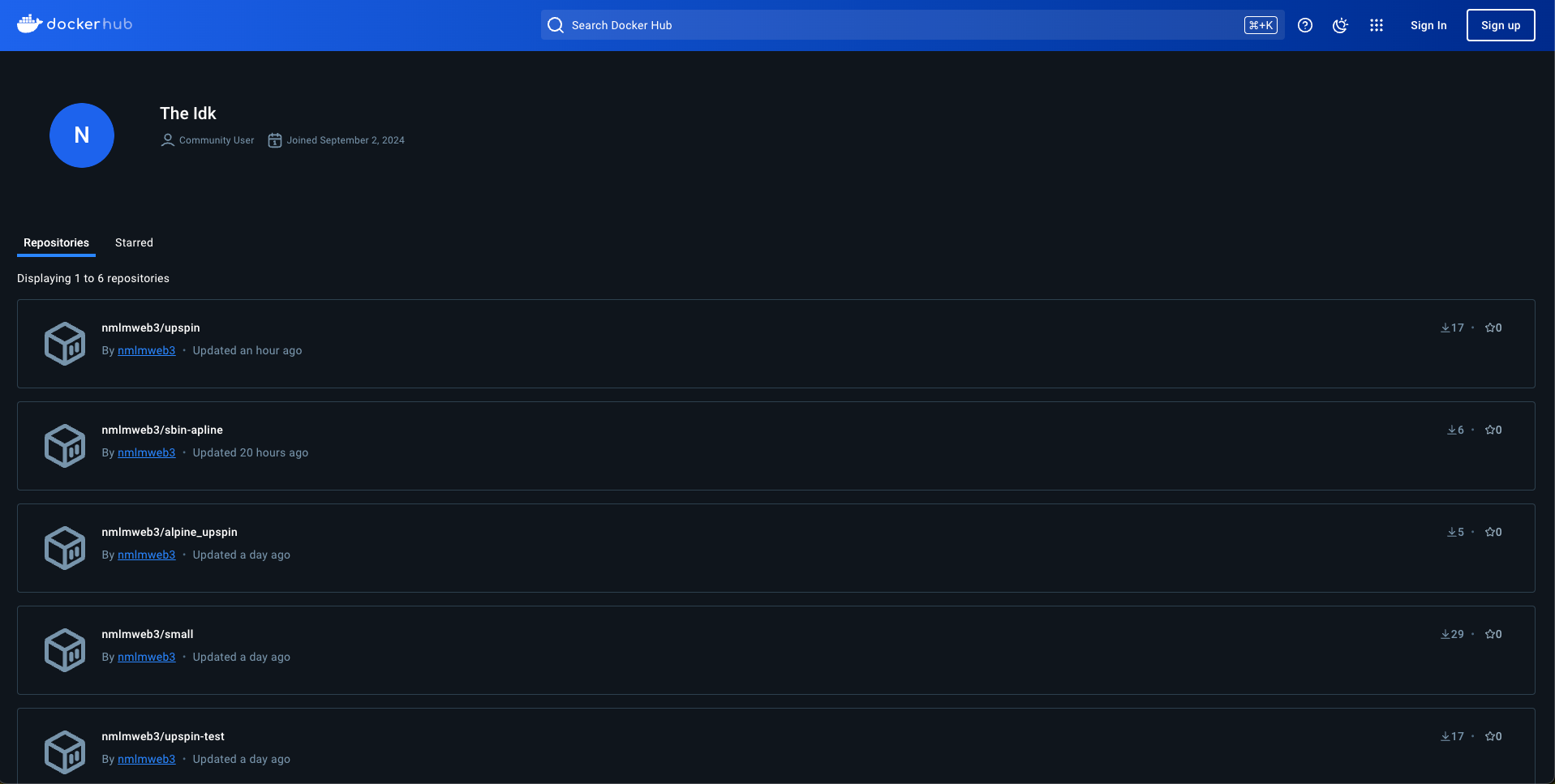 For any IPs discovered with the target ports open, the malware attempts to spawn a new container with the name alpine. This container is based on an image named upspin, hosted on Docker Hub by the user nmlmweb3. At the time of writing, this malicious user was still active in Docker Hub and had six repositories listed under their account.