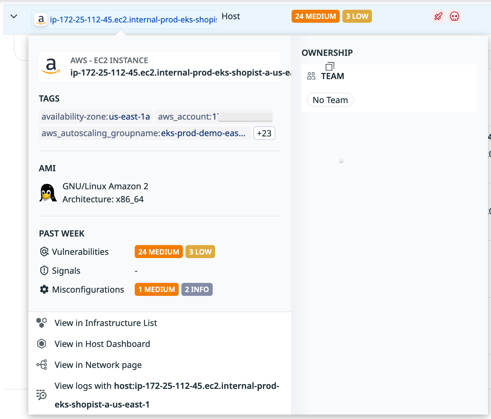 Hovering your mouse over any affected virtual machine or container allows you to benefit from additional context such as the cloud account it's running in, operating system and misconfigurations that may affect it. It also enables you to easily pivot to observability data such as logs or network connections.
